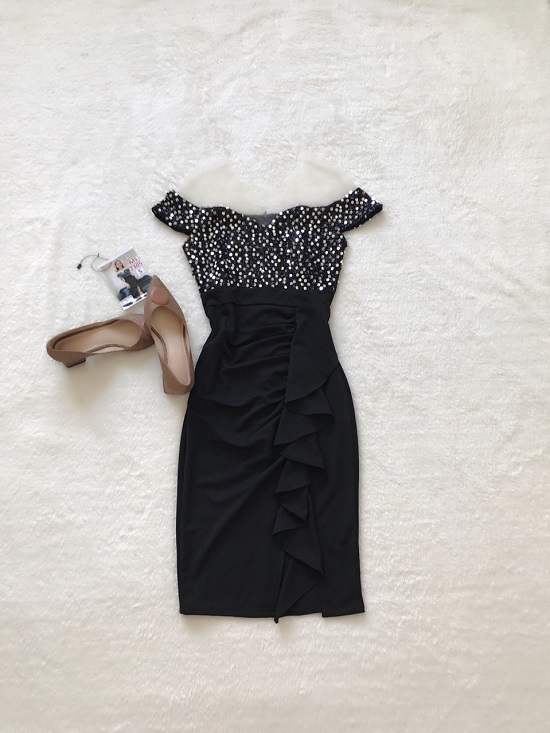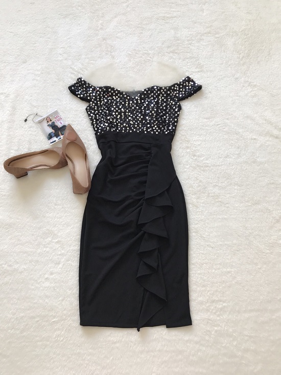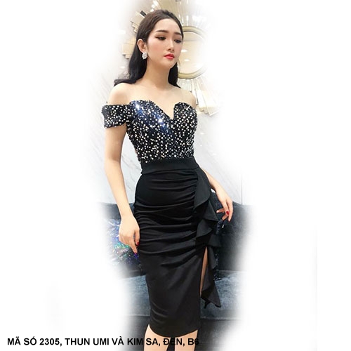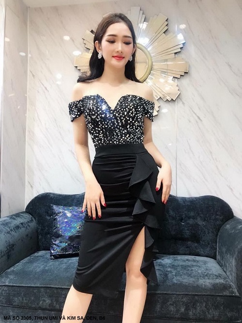 ĐẦM ÔM TRỄ VAI ĐÍNH KIM SA VÁY DÚN BÈO BÊN EO